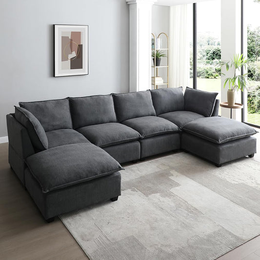 130" Modular U-Shaped Linen Sectional Sofa with Ottoman