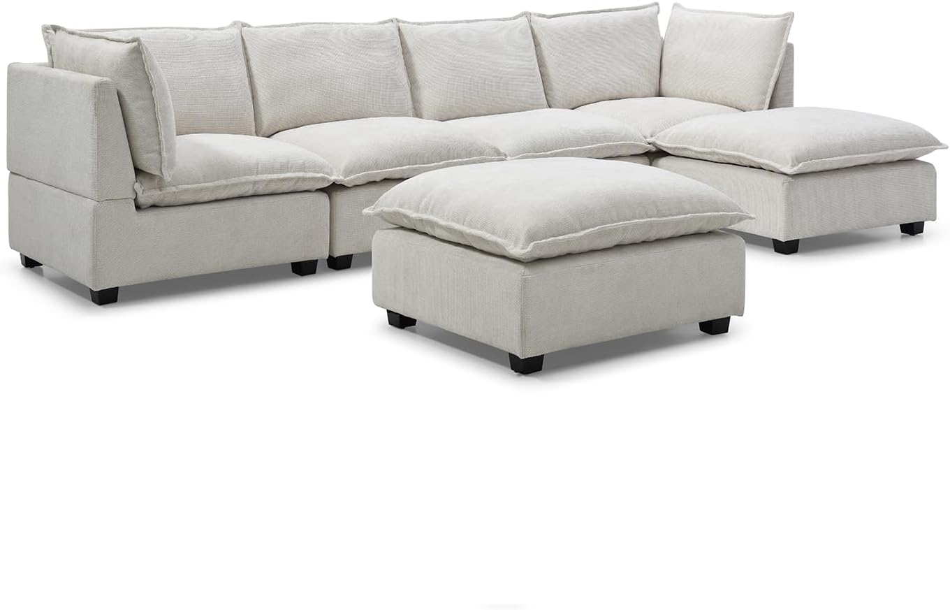 130" Modular Sectional Sofa Couch for Living Room, Modern 6-Seat Linen Fabric Sofa Couch Set with Convertible Ottoman,U Shaped Sofa Freely Combinable Sofa for Home Apartment Office, 2 Pillows