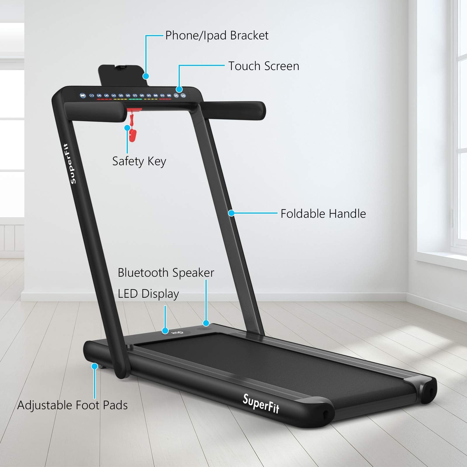 - WITH BLUETOOTH SPEAKER, PHONE HOLDER, REMOTE CONTROL & APP CONTROL -- Connect the Superfit treadmill to your phone through Bluetooth, so you can play music while you are exercising. You can also use the phone holder to watch videos or chat with friends. The remote control (BATTERY NOT INCLUDED) is convenient to adjust the speed of movement and stop instantly. Smart APP control is perfect for recording exercise data and running with other users.
