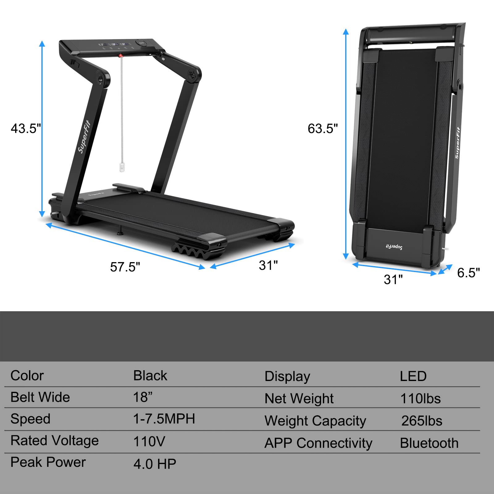 4.0HP Heavy Duty Folding Treadmill, Electric Foldable Superfit Treadmill with LED Touch Screen