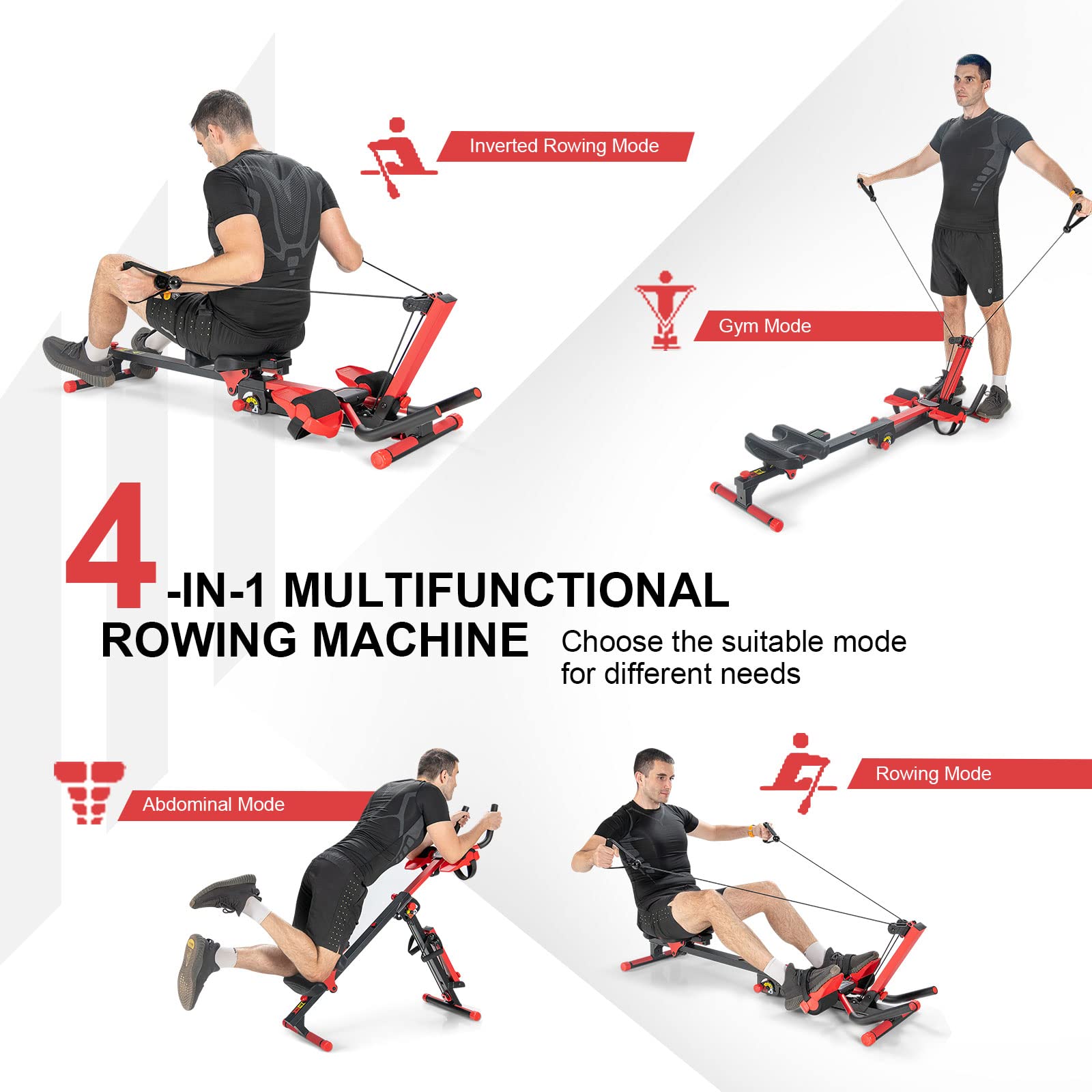 4 in 1 Folding Rowing Machine, AB Crunch Workout Machine w/3-Level Angle & Adjustable Tension