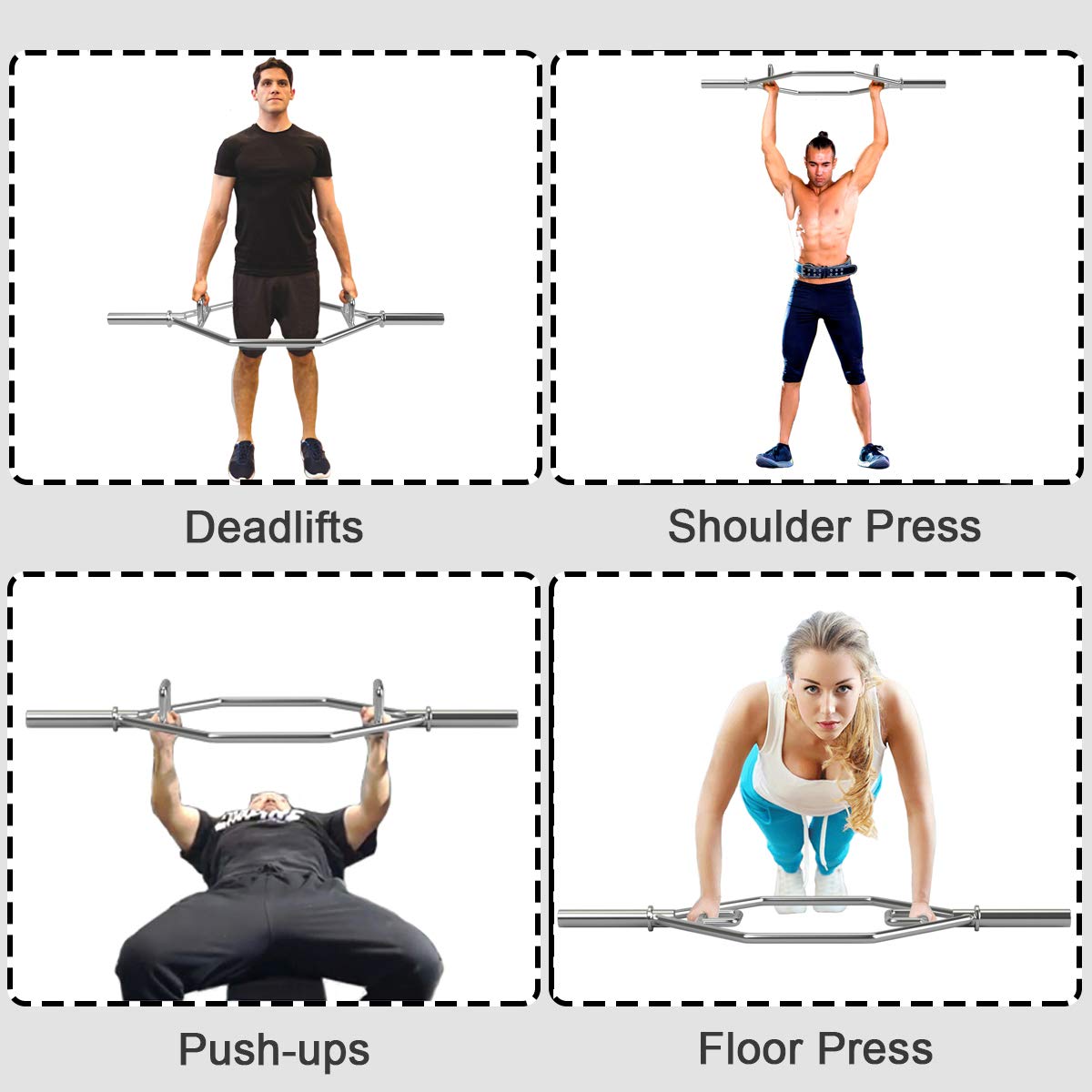 Made of heavy-duty steel with chrome finishing, our Olympic hex bar is rust and wear resistant. You are free to add weight plates to the loadable sleeve, as long as the thickness and the weight of plates does not exceed the limit of the bar. And the whole product has the maximum bearing capacity of 800 lbs. Except for that, 2 snap springs, included in the package, help you fix and lock the weight plates tightly. 2 different grip positions, both are knurled to increase friction, meet your different fitness needs. It is worth mentioning that the grip can be folded.