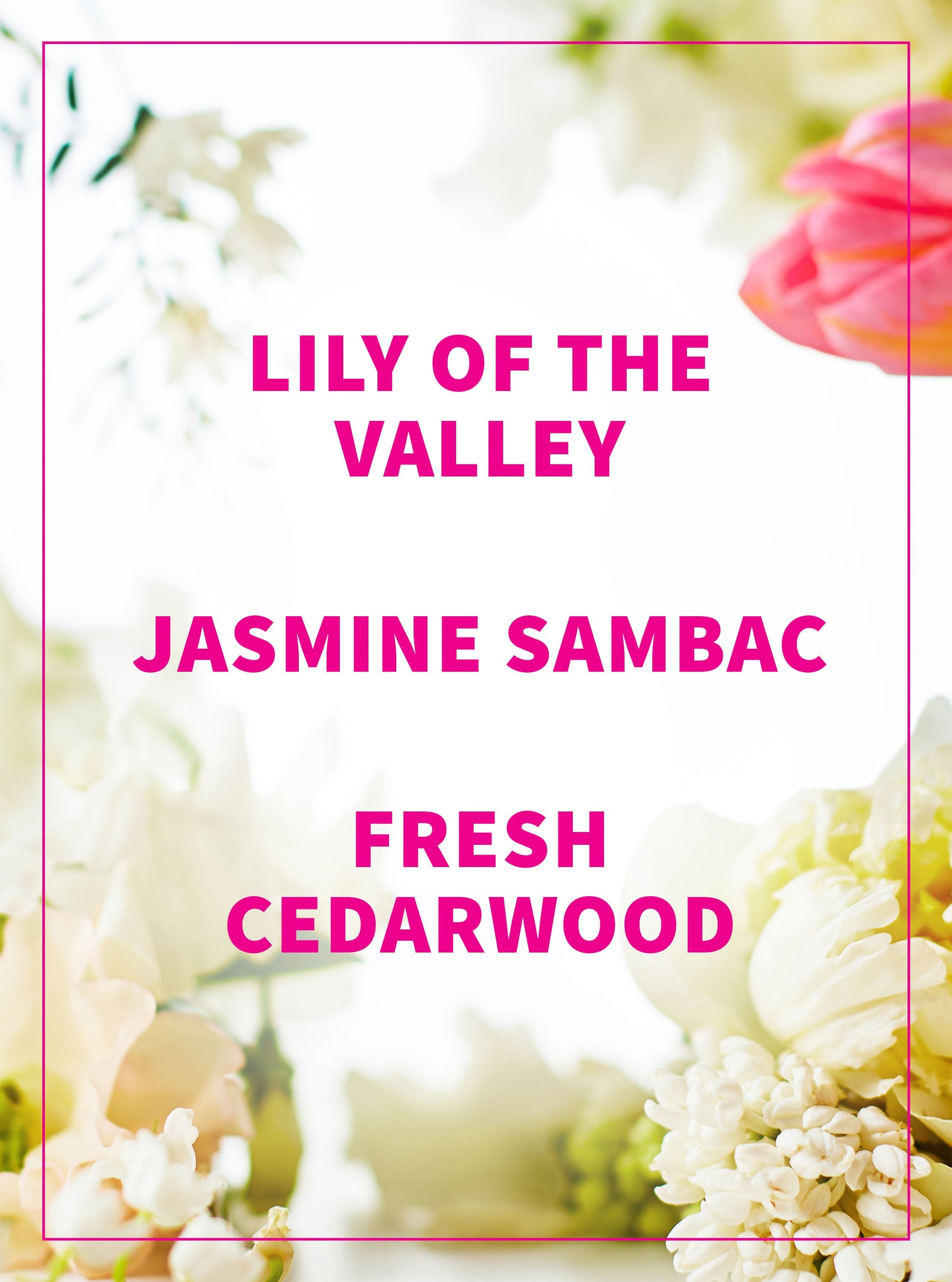Fragrance notes: lily of the valley, jasmine sambac, garden carnations and fresh cedarwood.
