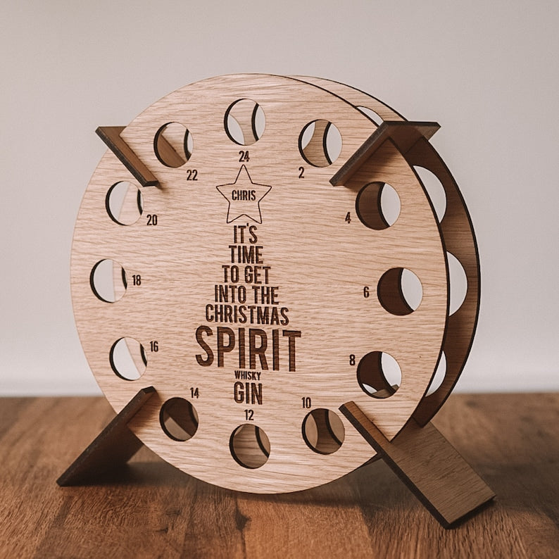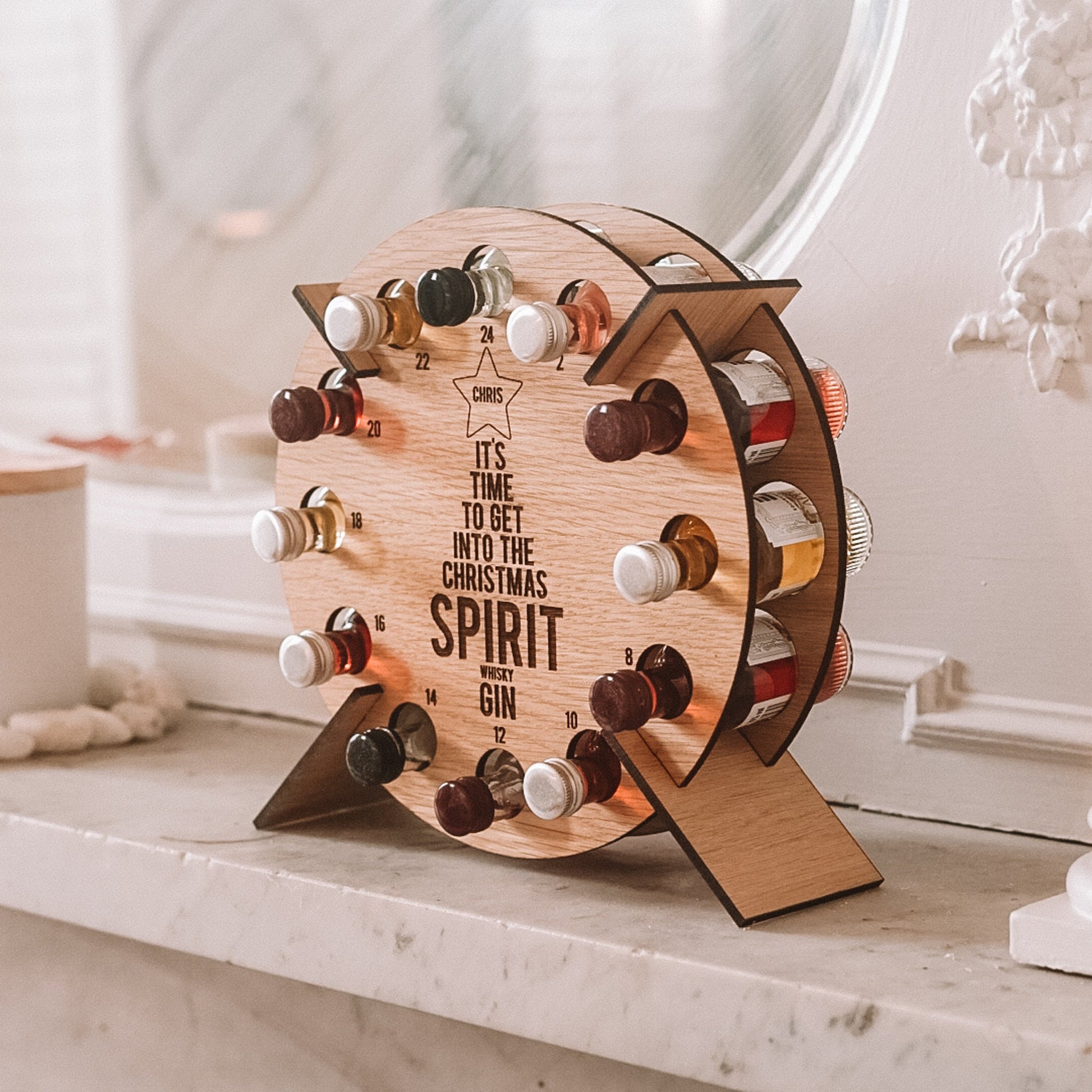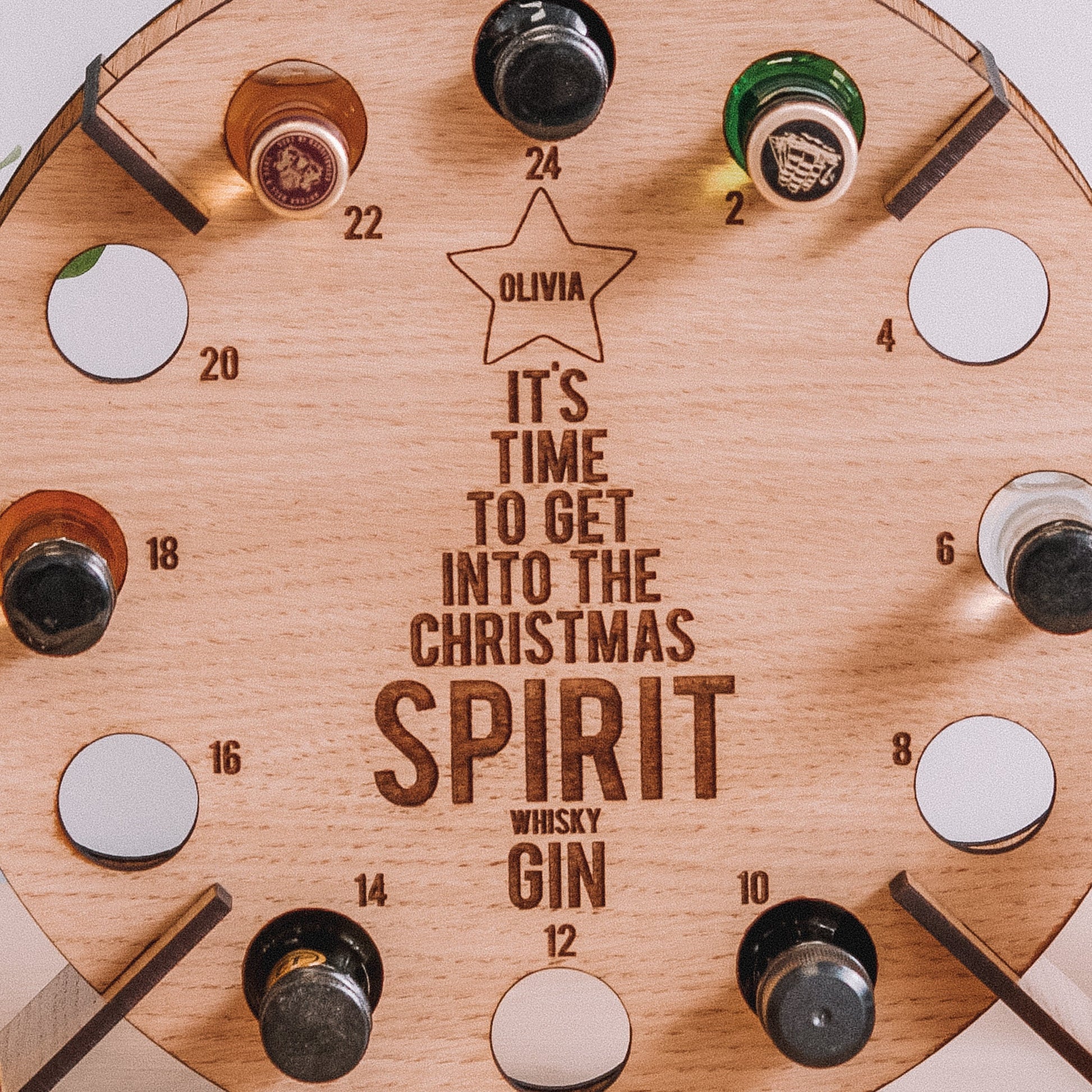 Our personalised countdown Advent calendar for miniatures holds most spirits miniatures (please check sizes, see below). You can of course put in a selection, depending on your preference and then every second day up until 24th December, you can celebrate.