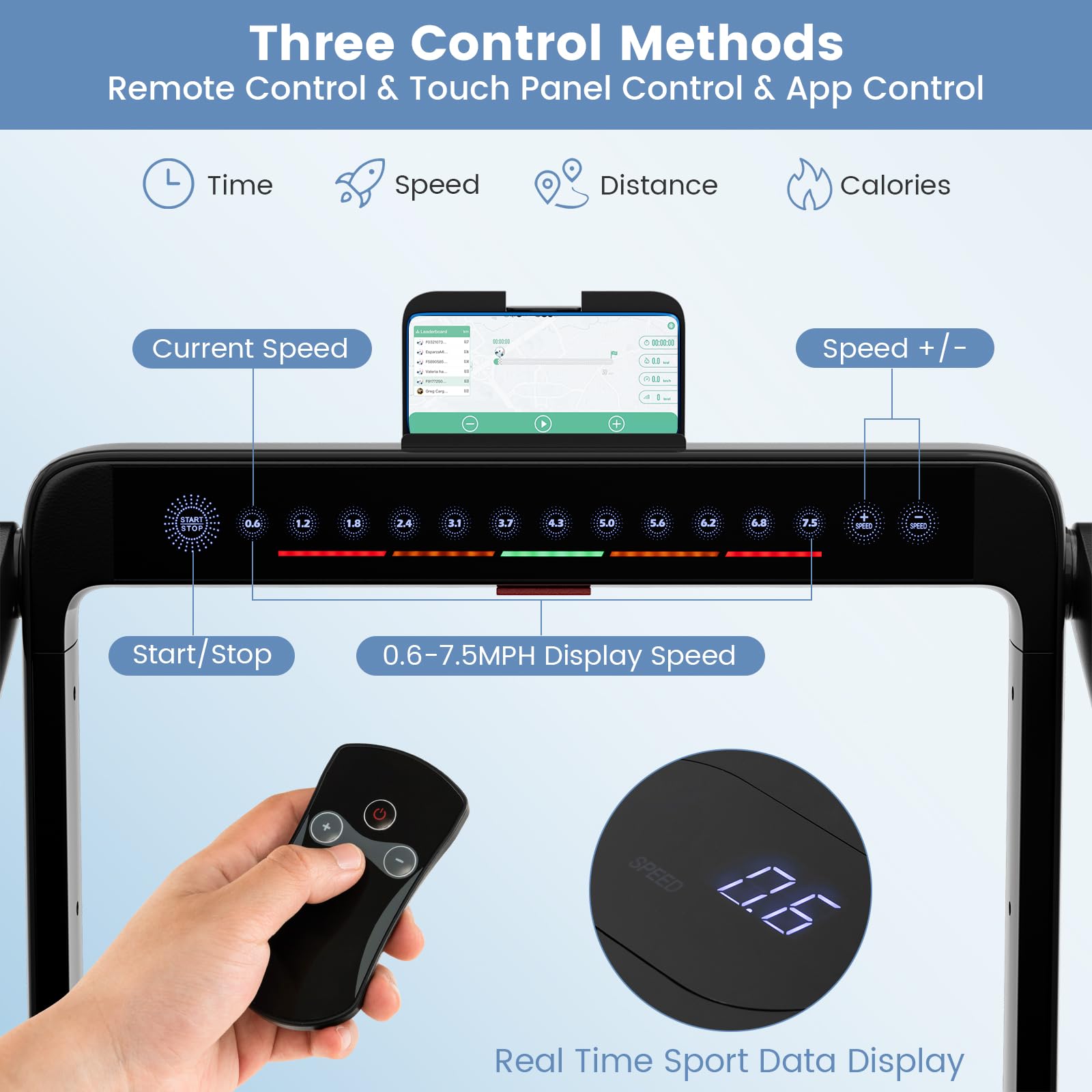 - Up to Three Control Methods - Remote control: an LED display shows your real-time sports data, which are time, speed, distance, and calories. Touch panel control: the operation is easy with a start/stop key and speed +/- shortcut key, and the screen displays a 0.6-7.5mph current speed. App control: download the GYMAX app and you can enjoy rich functions including various training courses, personal sports plans, exercise data records, real-time sports ranking, and a dynamic community.