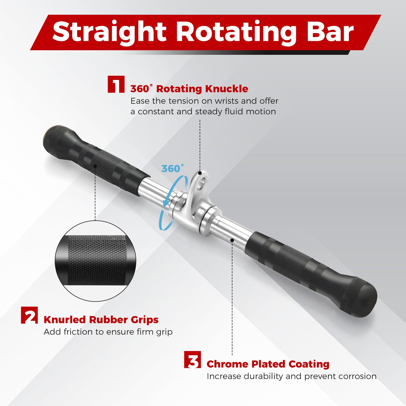 - 5PCS for Versatile Workout Options: This cable machine attachment set includes a V handle, a double D handle, a straight rotating bar and a tricep rope. It allows for a variety of exercises targeting different muscle groups, such as triceps extension, LAT pulldown, seated row and biceps curl.
