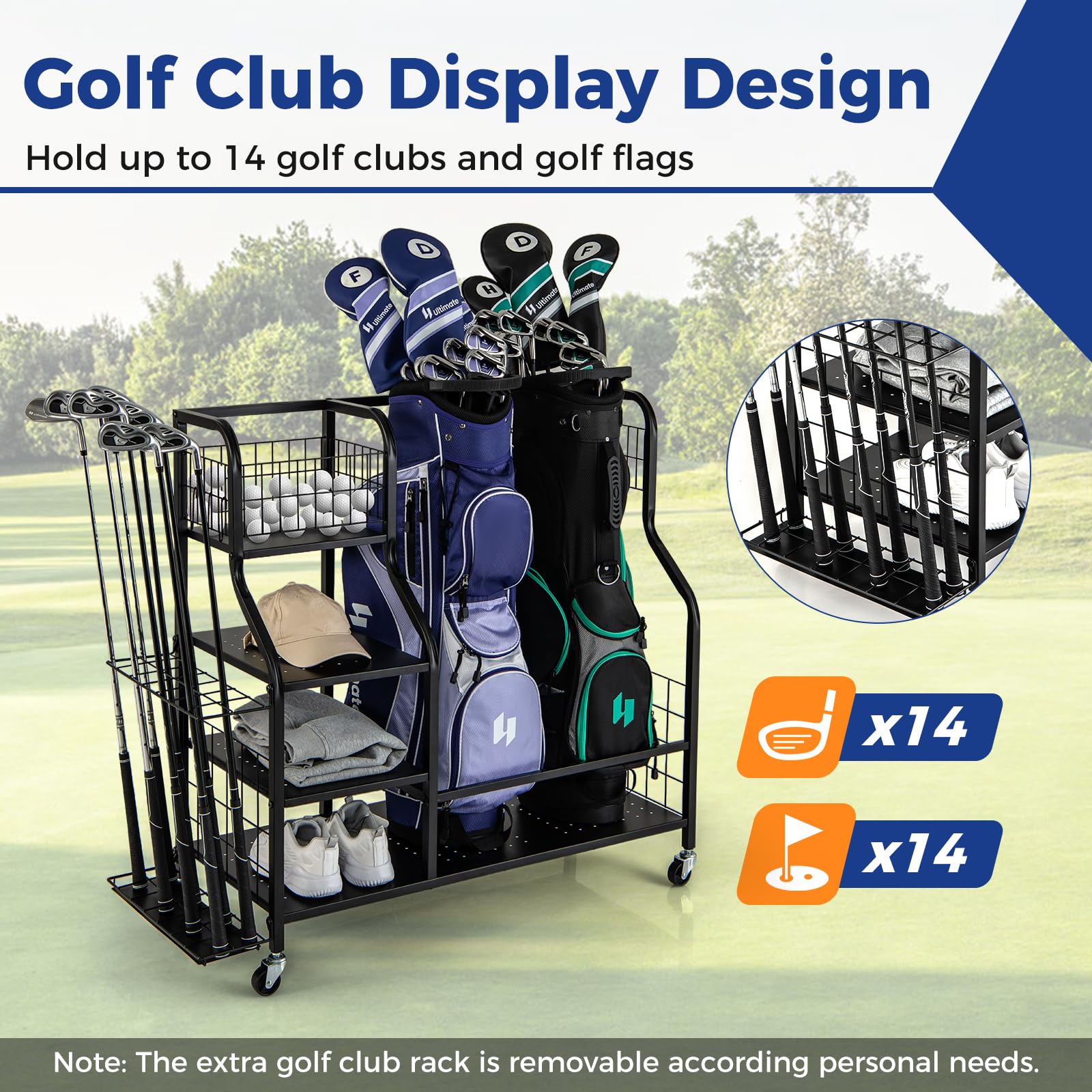 - ???¡¾Extra Storage Rack for Golf Clubs¡¿ With a golf club display design, this golf bag stand is equipped with an additional golf club rack designed to hold up to 14 golf clubs and golf flags. Note: The extra golf club rack is removable according to personal needs.