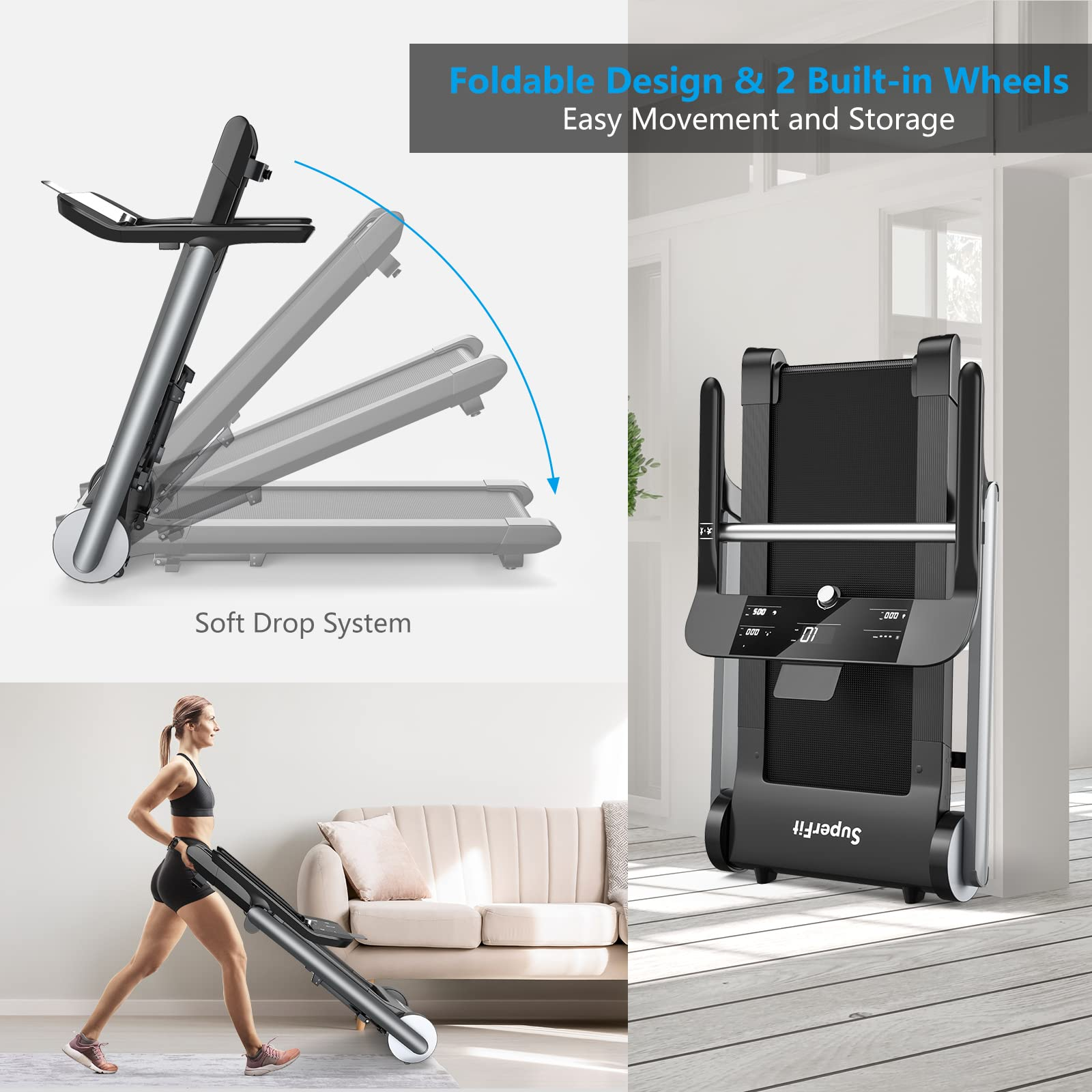 This electric treadmill has a clear LED display, which will show your speed, time, distance and calories to know your fitness data directly. And the heart rate belt monitors your heart rate more accurately. Besides, you can adjust the speed from 1 MPH to 9.9 MPH and choose present programs from P1 to P10 based on your various exercise demands. What's more, the ultra quiet motor avoids disturbing others while running or walking. Considering your safety, the running belt is shockproof and non-slip to protect your knees and joints from accidental injury. And you are able to press the fatigue button in order to slow down the speed immediately. After running, this portable treadmill with 2 built-in wheels allows you to fold for easy movement and storage.