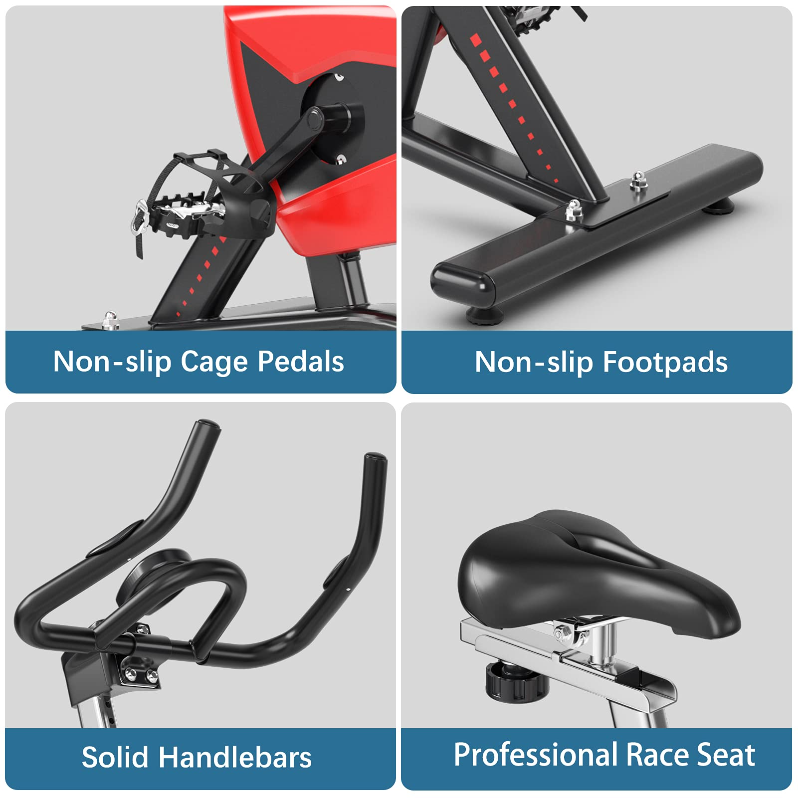 The 35lbs flywheel offers you a smooth spinning ride and a quite exercise environment. And the controlling knob can be used for magnetic resistance adjustment and emergency stop as well. In addition, heavy-duty steel frame and anti-slip footpads ensure high stability, durability and safety. The exercise bike is suitable for all kinds of people as its seat cushion and handlebars can be adjusted into multiple positions, so you and your family all can enjoy a healthier lifestyle with our magnetic exercise bike. If you are tired of going to a gym far away for exercise, why not own a premium exercise bike for yourself?
