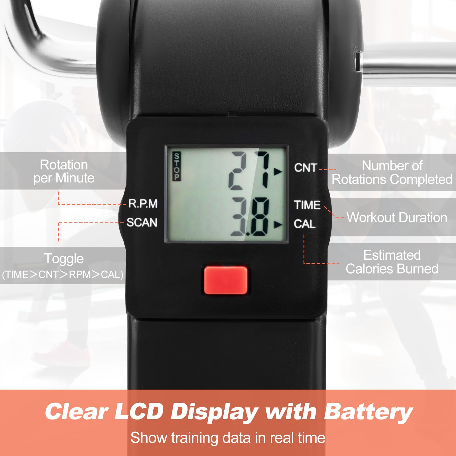 - Digital LCD Display: The built-in LCD monitor displays essential workout data including time (workout duration), SCAN (toggle TIME£¾CNT£¾RPM£¾CAL), CNT (number of rotation completed), CAL (estimated calories burned) and RPM (rotation per minute).