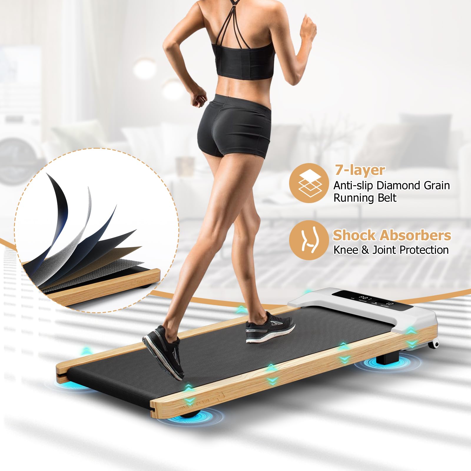 - Dual Security Measures - Apart from shock absorbers for knee and joint protection, this under desk treadmill also boasts 7-layer anti-slip diamond grain running belt to prevent accidental slips or falls. Besides, the running belt is long and wide for a comfy workout experience.