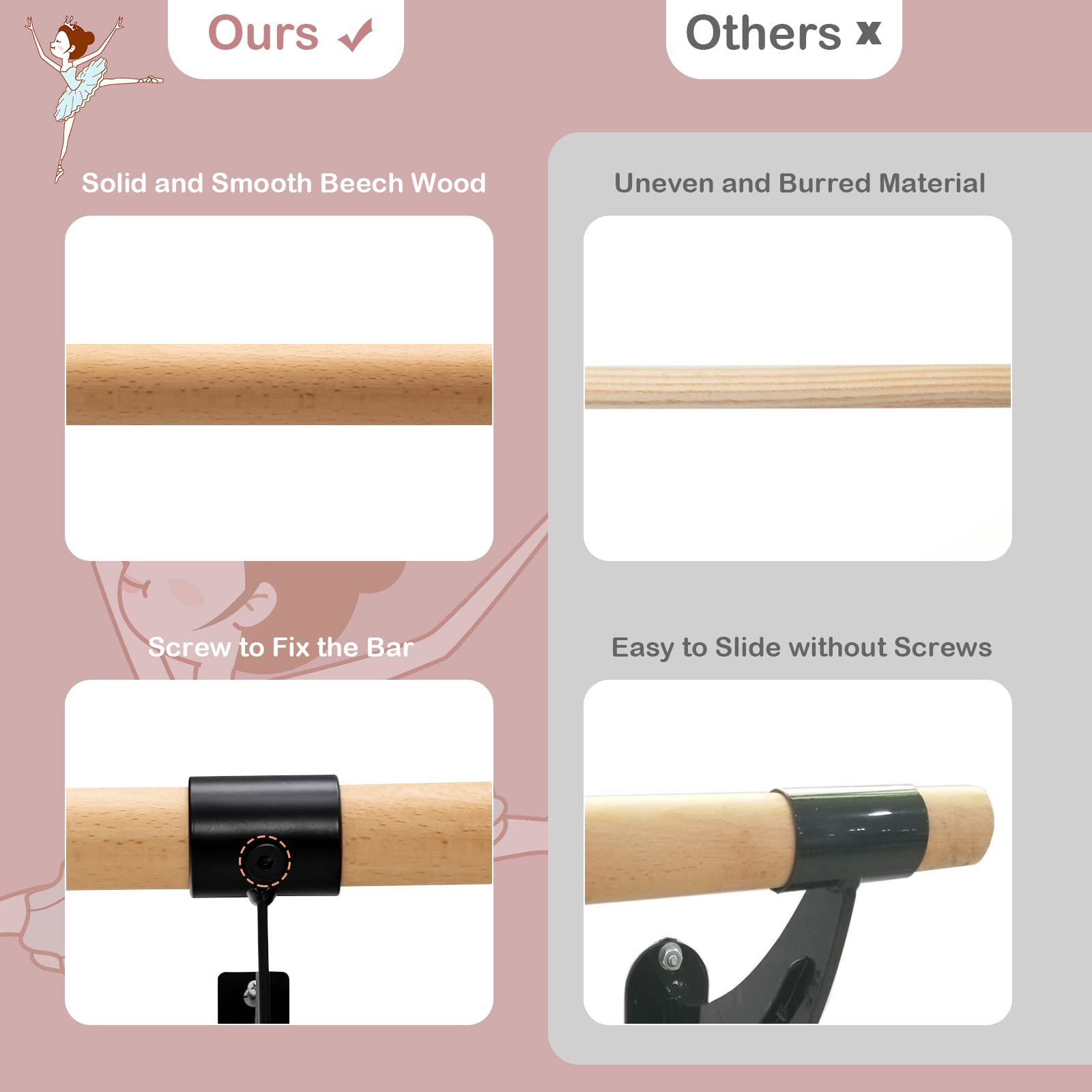 - Natural Beech Wood: This wall-mounted ballet bar is crafted from solid beech wood for a longer service time. What's more, the smooth and burr-free surface will protect your skin from scratches while you are exercising.