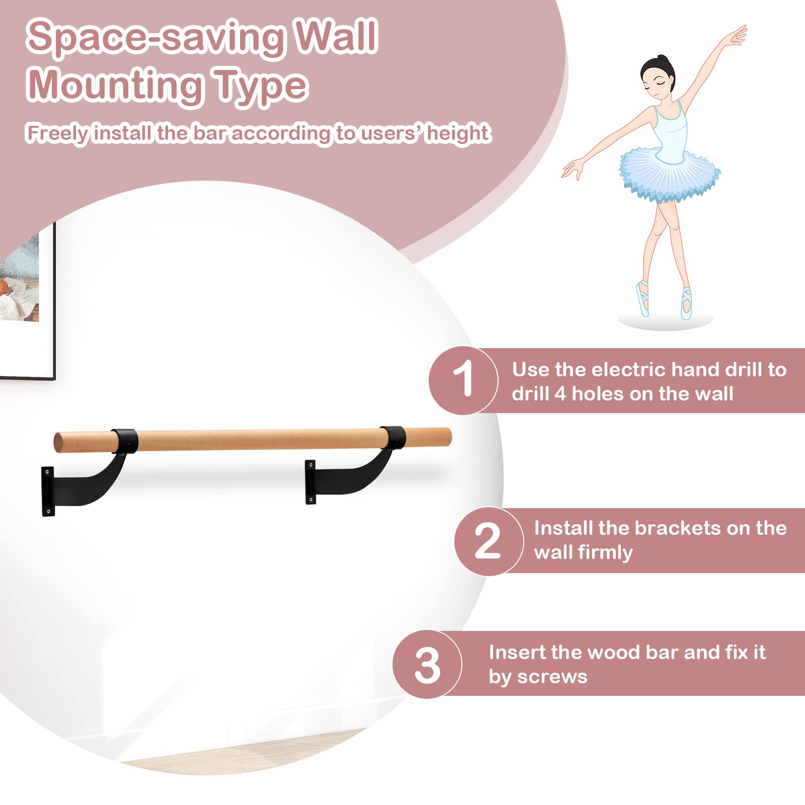 - Wall-Mounted Design for Any Height: The solid wood dance bar features a wall-mounted design, you are able to determine the mounting position according to the user's height. Whether you are a teenager to an adult or a beginner to an advanced level, almost anyone can use this exercise ballet bar without difficulty.