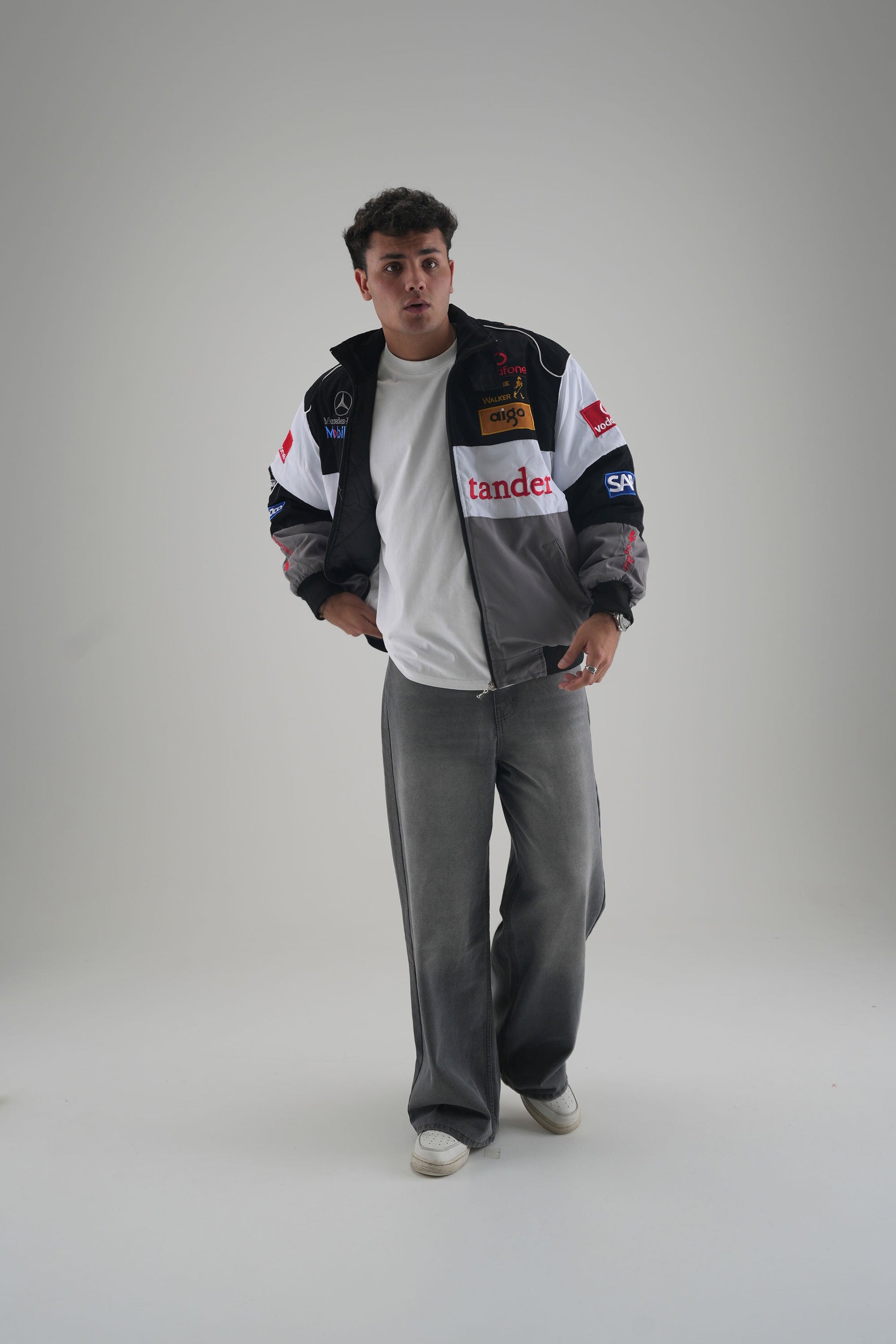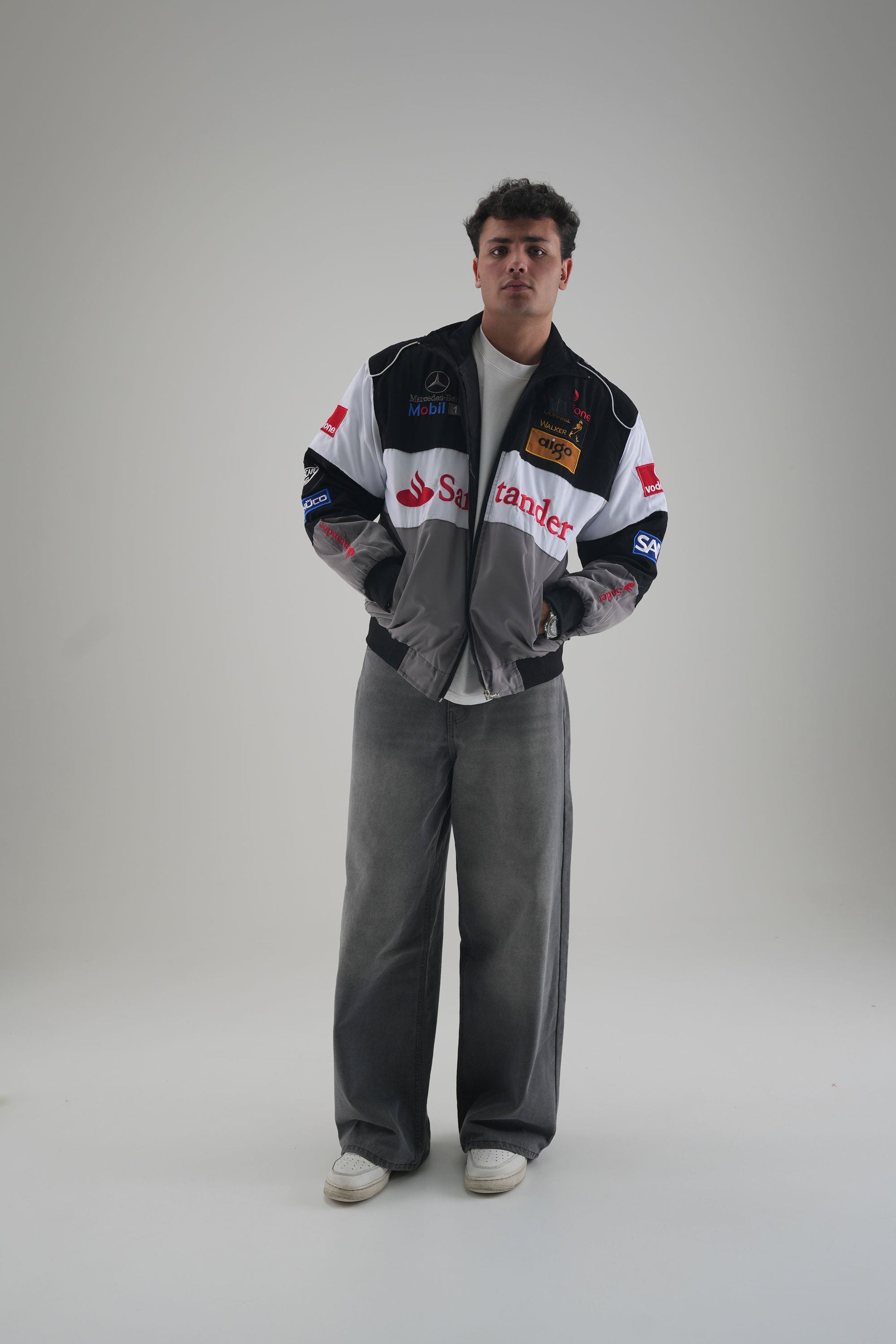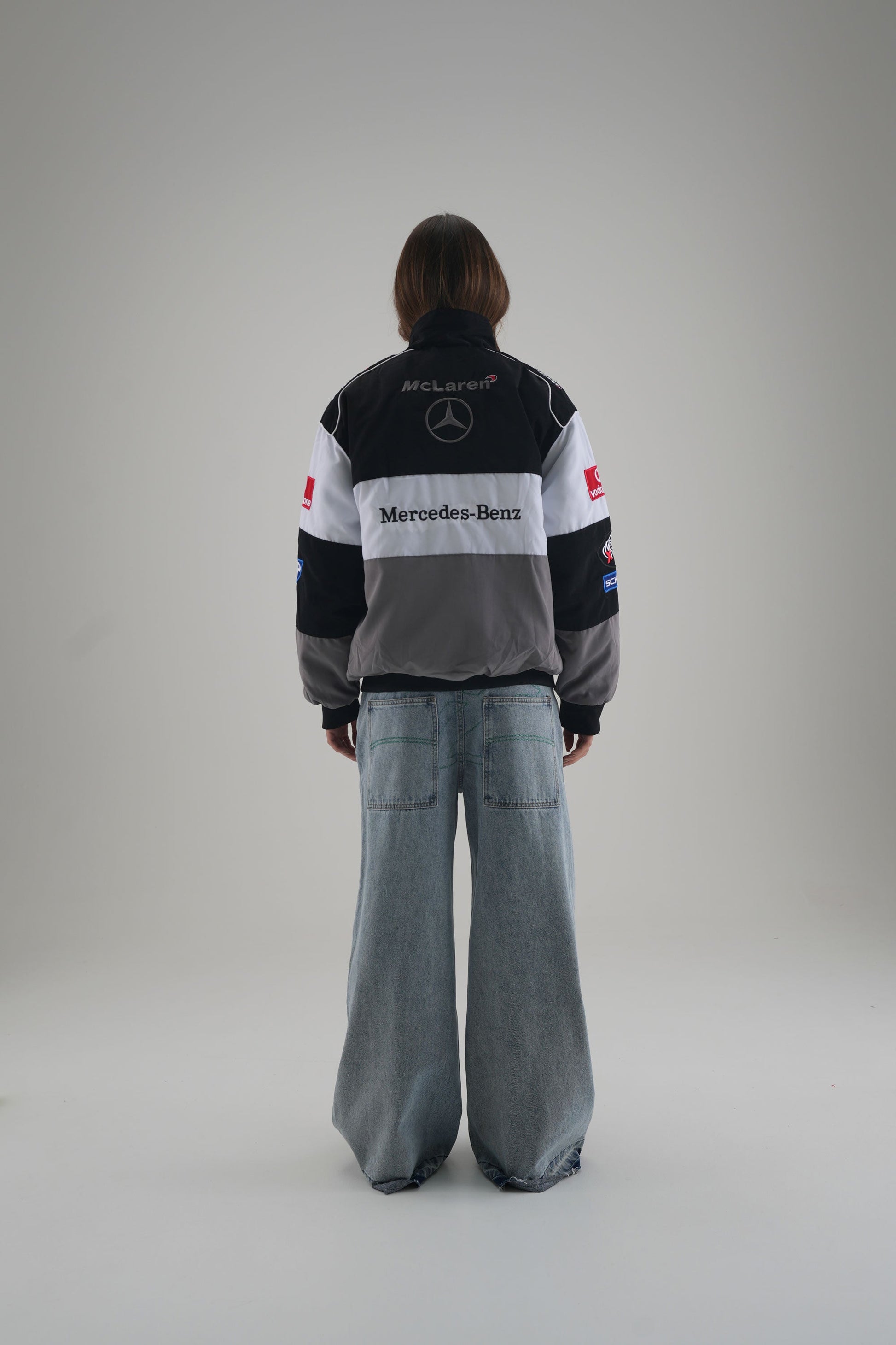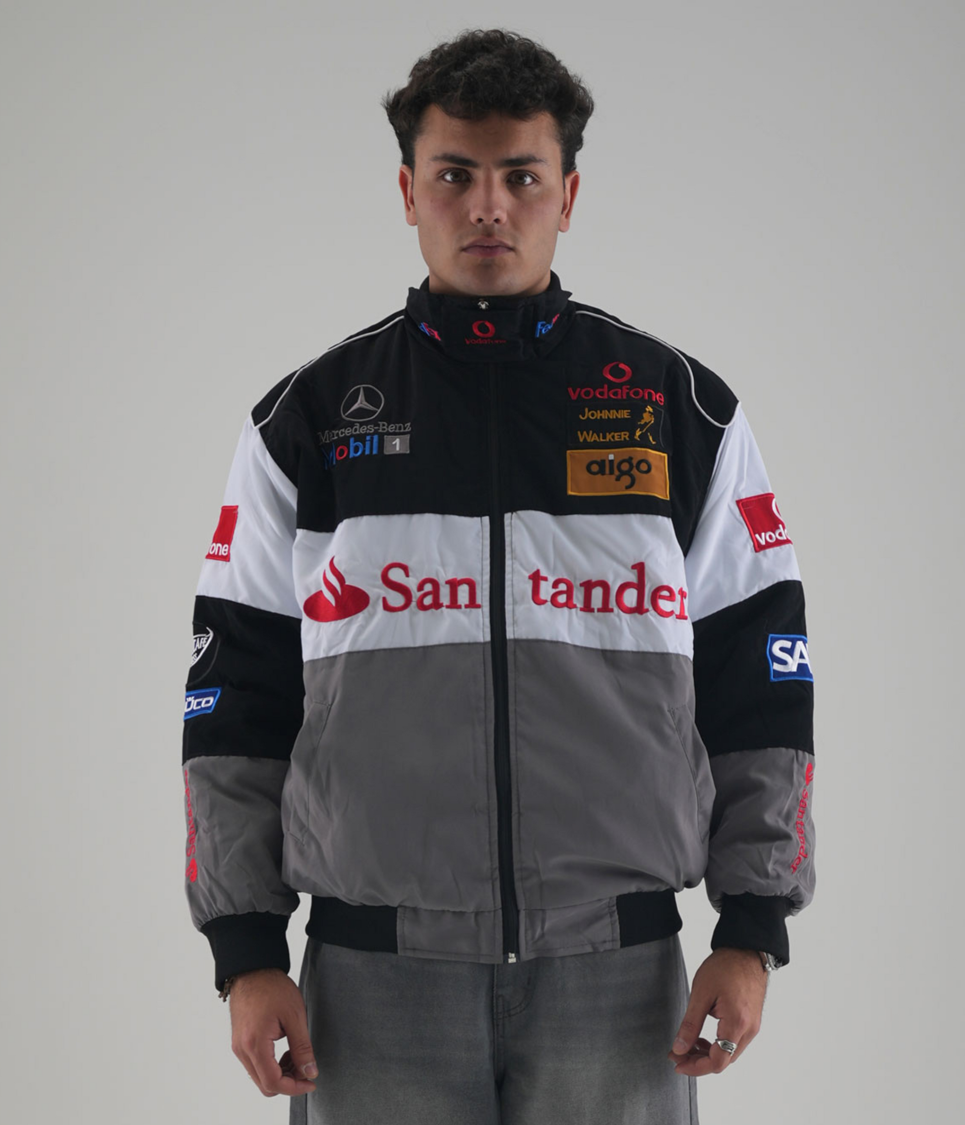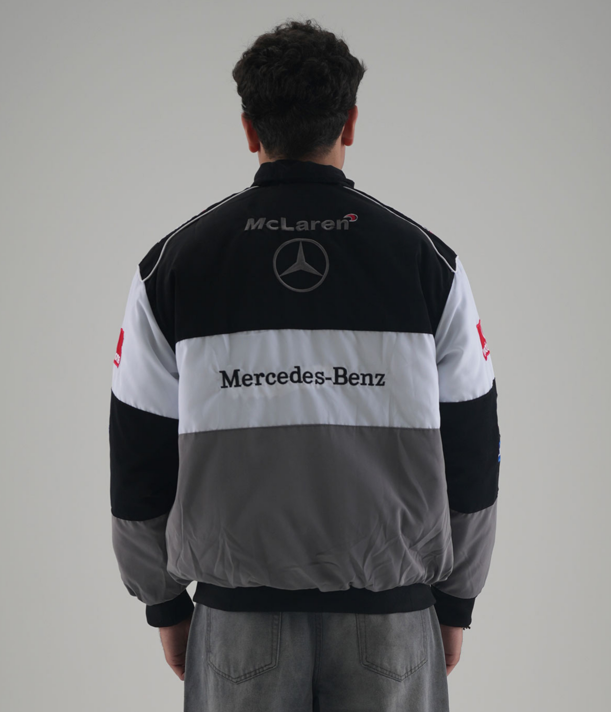 Classic tones, legendary heritage. The McLaren F1 x Mercedes-Benz Vintage Jacket combines gray, white, and black panels with retro F1 detailing and authentic sponsor patches. Inspired by the early 2000s era, its heritage fit and subdued palette make it a timeless piece for collectors and fans of understated racing style.