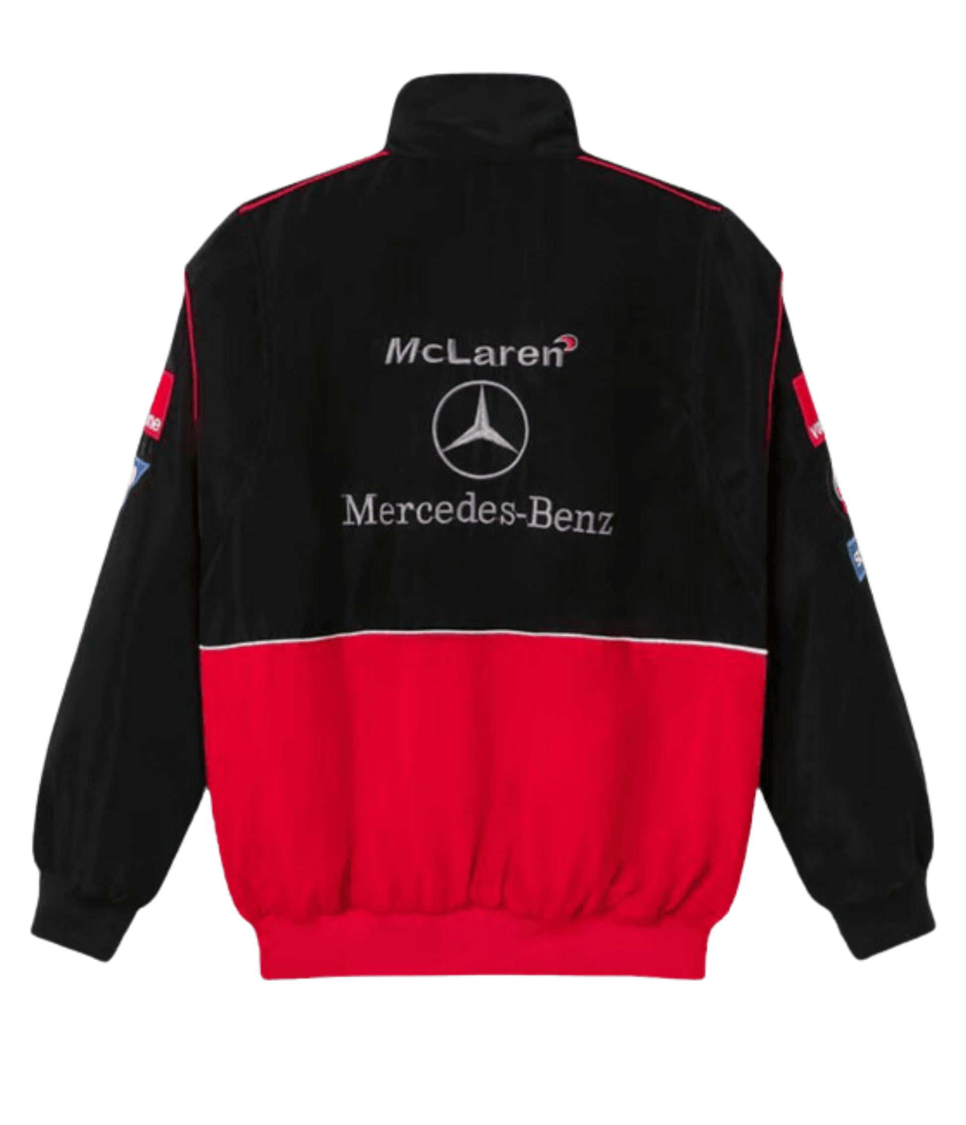Bold, fast, unforgettable. The McLaren x Mercedes-Benz Vintage Jacket – Red Edition pays tribute to the iconic team’s racing legacy with a vivid red base, retro sponsor logos, and authentic F1 detailing. Designed with a heritage fit and standout contrast, it’s a must-have for fans of speed, history, and McLaren’s golden era.