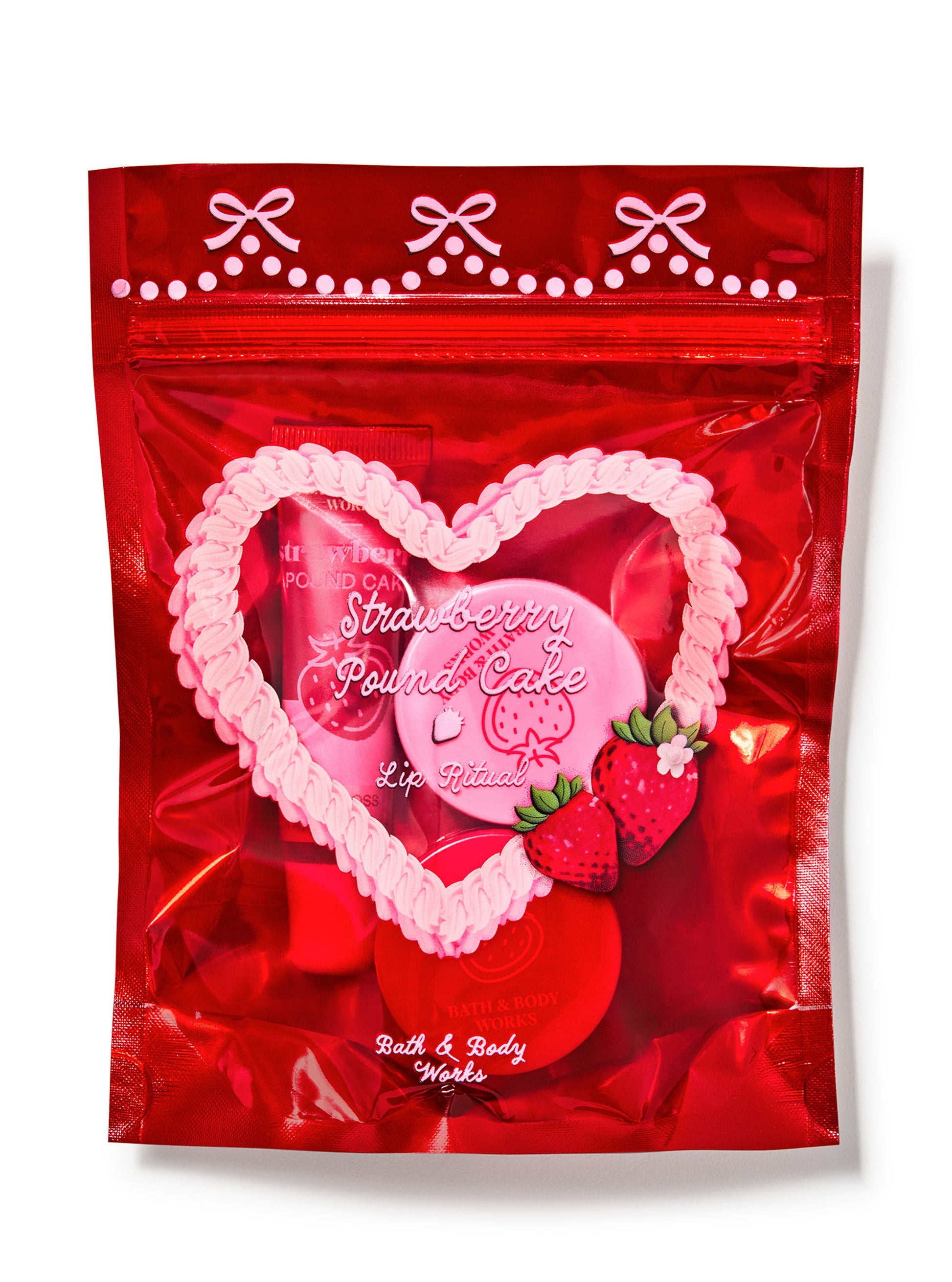 - Includes Strawberry Pound Cake lip mask (.73 oz), exfoliating lip scrub (.5 oz) and lip gloss (.47 fl oz).